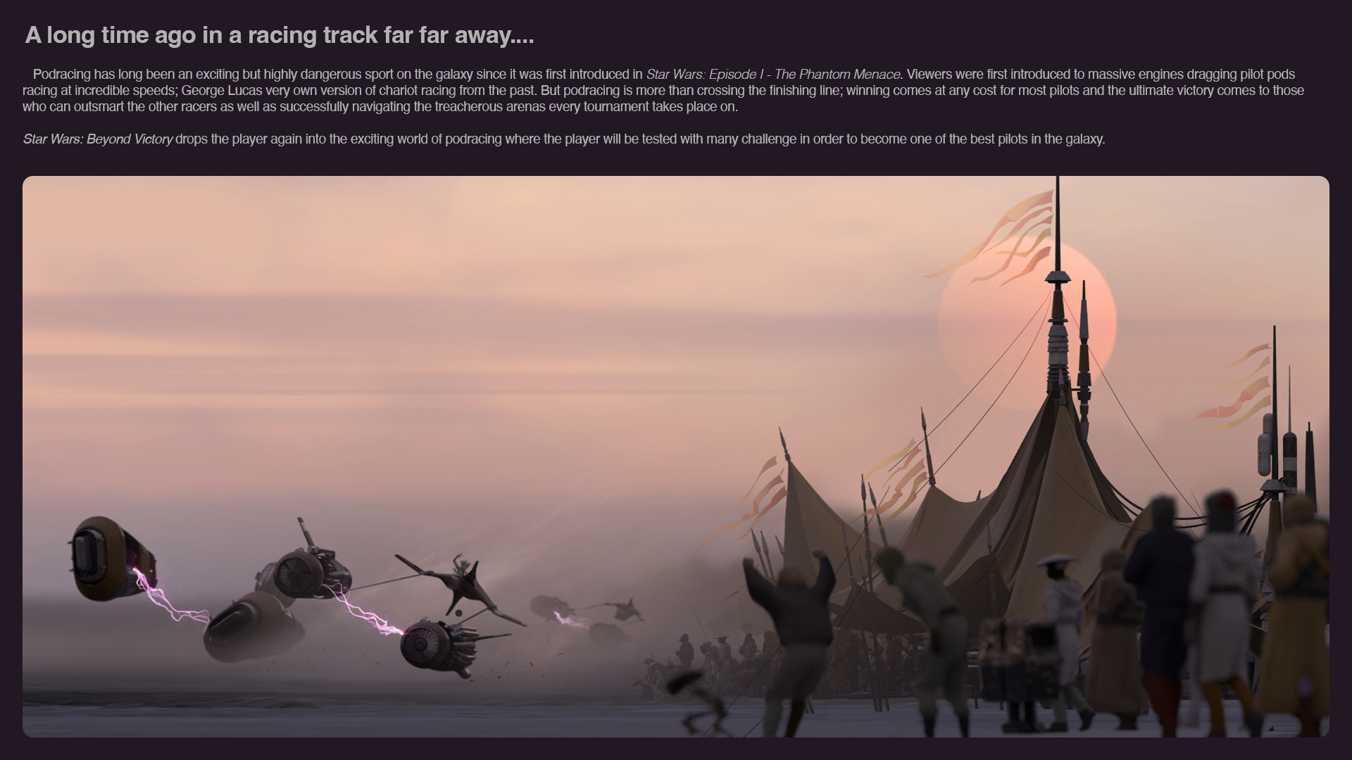 Star Wars: Beyond Victory is a mixed reality playset first released by ILM and Lucasilm in 2025. Set during the Reign of the Empire, Beyond Victory introduces players to an original story that blends the thrilling world of podracing, a stellar cast, powerful narrative and mixed reality play.