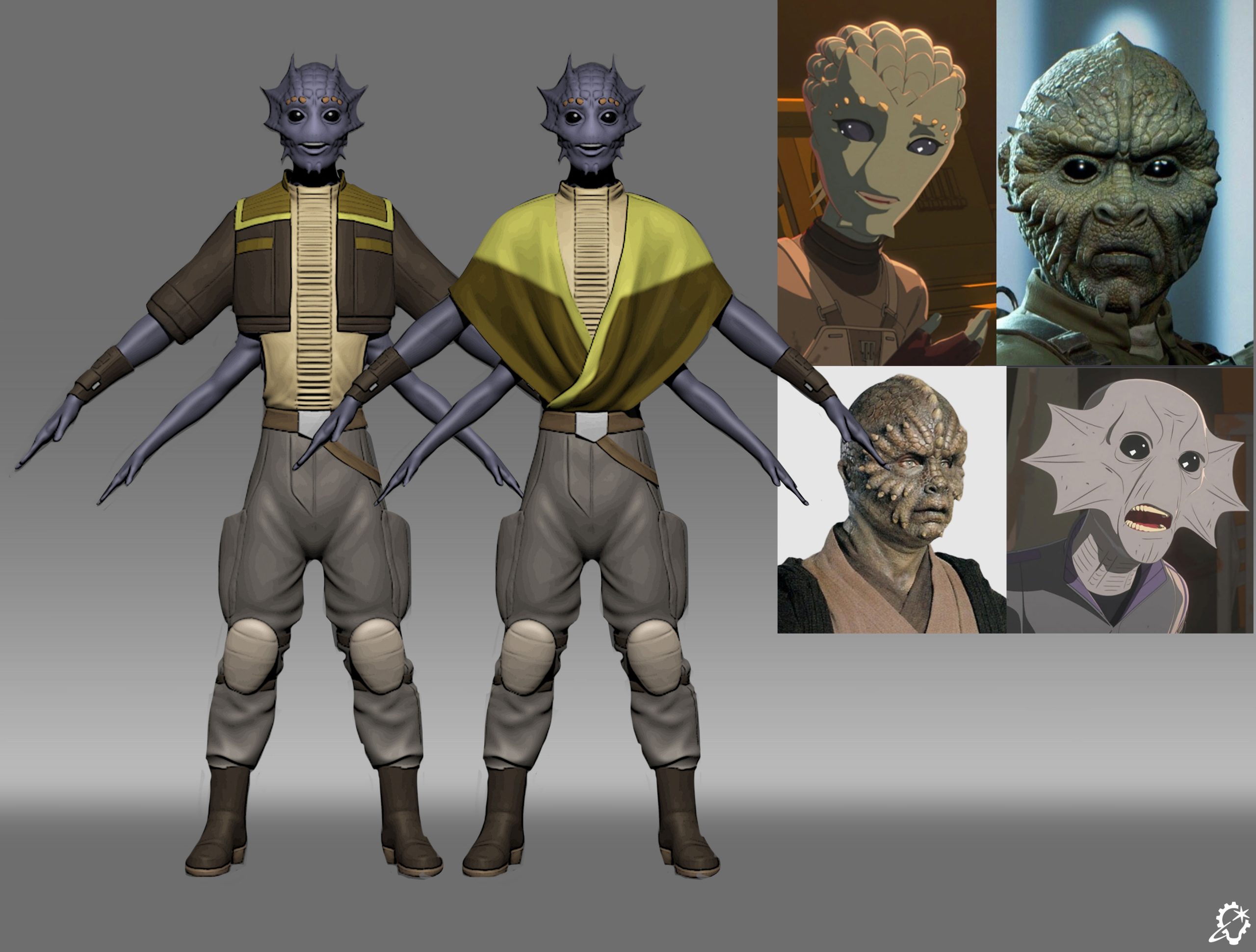 Volo is our main/player character, and there were a few different physical traits they had to have, storywise; mainly, they had to be on the smaller side for podracing prowess, and have four arms for some specific game mechanics they wanted to incorporate. Besides that, it was a very open brief.